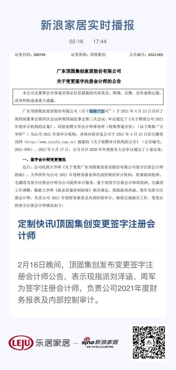新浪定制频道讯 2月16日晚,顶固集创发布变更签字注册会计师公告,表示现指派刘泽涵、周军为签字注册会计师,负责公司2021年度财务报表及内部控制审计。