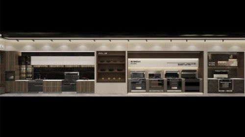 店面内部灯光明亮通透,错落有致,陈列的集成灶、集成水槽等招牌产品在灯光的映射下别具一番风味,煞是吸睛。