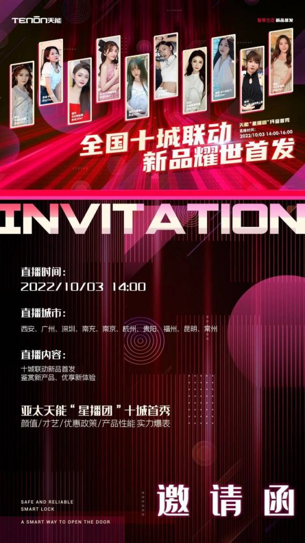 万众期待的国庆节即将到来,这个假期,智能锁圈将有一件大事发生!10月3日14:00-16:00,亚太天能将以十城同时直播的方式,邀请10位知名网红达人组成“天能星播团”,空降广州、西安、南充、南京、昆明、常州、贵阳、福州、深圳、杭州十个城市的经销商标杆门店,面向全国消费者隆重发布全自动系列新品A6s智能锁。