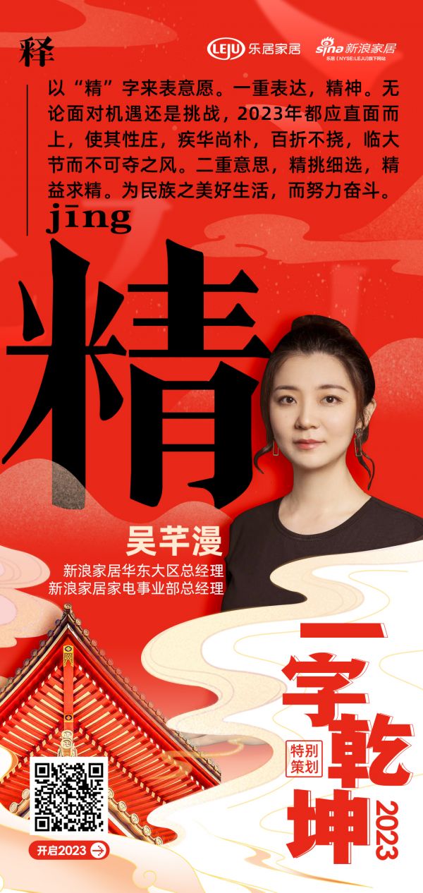 在“2023 一字乾坤”活动中,新浪家居华东大区总经理兼新浪家居家电事业部总经理 吴芊漫用「精」字表达了2023年的规划策略及目标:“精”字一重表达,精神。不管是面对机遇,还是困难或者挑战,2023年我们都应直面而上,使其性庄,疾华尚朴,有百折不挠,临大节而不可夺之风。精”字二重意思,精挑细选,精益求精。为民族之美好生活,而努力奋斗。