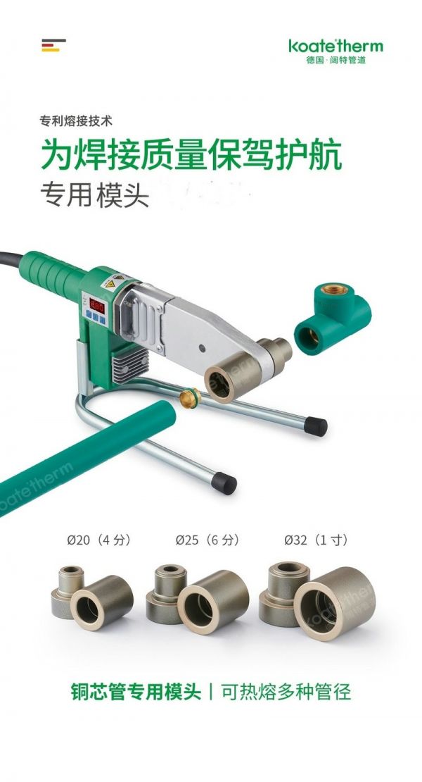 为确保管道焊接质量,请使用阔特专用热熔机,该热熔机功率大、加热速度快,加厚铝板蓄热性能好,温度偏差小,具有超温保护,防止意外发生,为焊接质量保驾护航。