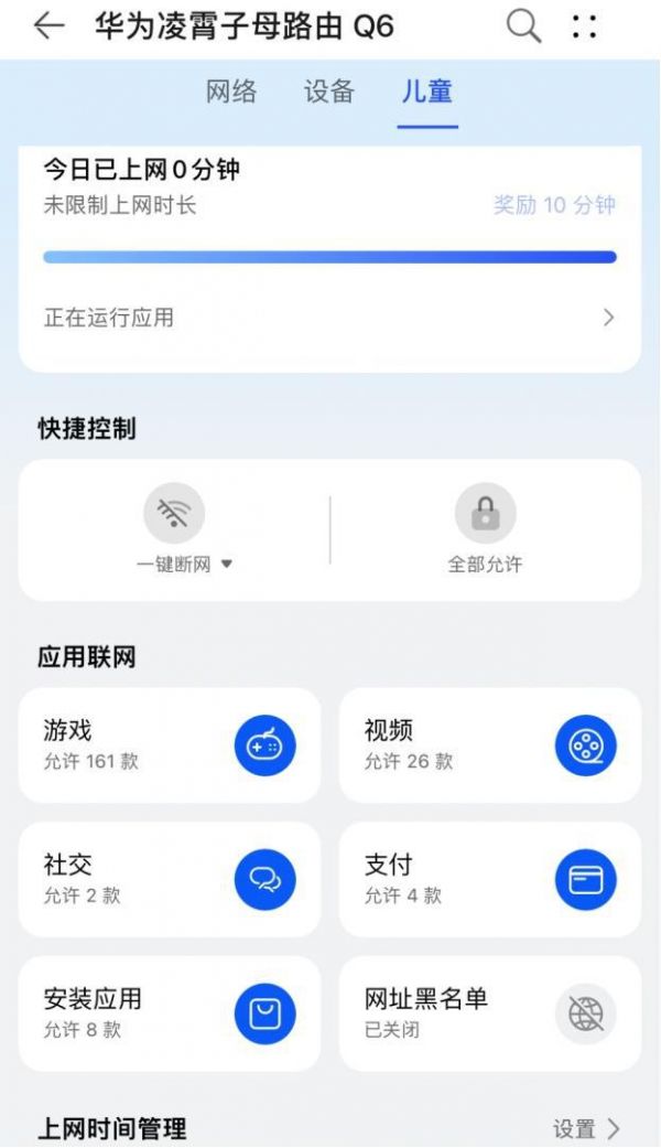 此外,相信家长们经常会面临一个头疼的问题:怎么让孩子合理使用网络?“一刀切”式的直接断网显然不可取,容易激起孩子逆反情绪,必须得用科学办法。鸿蒙智慧网络的儿童上网关怀功能具备规划能力,帮助家长和孩子共同制定上网计划、培养健康合理的上网习惯。具体操作上,家长可通过华为智慧生活APP,对儿童设备进行时长/支付/游戏/视频/社交的精细化设置和限制,合理规划上网时长,并能对色情/暴力/博彩等不良网站进行拦截,保护孩子健康上网。由此,家长既可实时精准获取孩子的上网行为报告,也能根据实际对孩子的表现进行奖励or纠正,双方增强互动进一步培养科学用网行为。