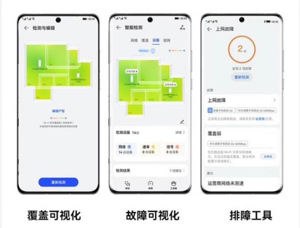 简言之就是让网络状态“可视化”,用户在华为智慧生活App上可以看到家庭Wi-Fi覆盖热力图,绿色代表网络良好,越偏红色代表信号越差,通过颜色分布便可轻松察觉家里哪个空间信号不好,补插一个子路由即可让Wi-Fi均匀覆盖。当然,如果用户没有华为路由器,也能通过智慧生活App的实验室,做信号热力模拟,以此来判断家里的路由器是否摆放在合理位置。华为路由器还向用户提供深度分析和检测工具。实际上,华为凌霄子母路由器研发团队依据消费洞察,归纳出近100种常见故障场景,可协助消费者轻松解决80%以上的常见故障。
