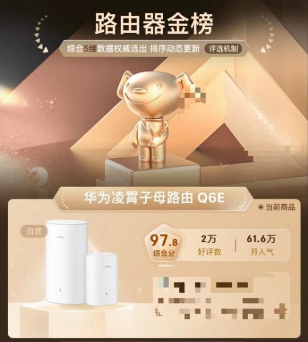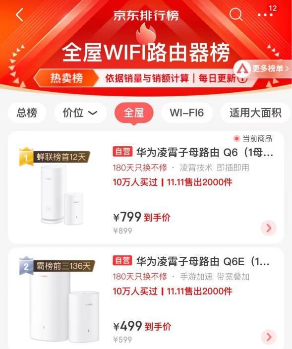 华为凌霄子母路由Q6E入选京东路由器金榜,Q6在京东全屋Wi-Fi榜排名第一,此前更是一度霸榜两百多天,超赞产品性能获得大批用户买买买!正值双十一,华为商城,京东、天猫华为官方旗舰店已开启华为路由器产品超值优惠,华为旗舰Q6套装直降100元;Q6E感恩回馈价499元起;性能旗舰AX6直降150元;AX3历史最低价199元……更多优惠等你解锁。