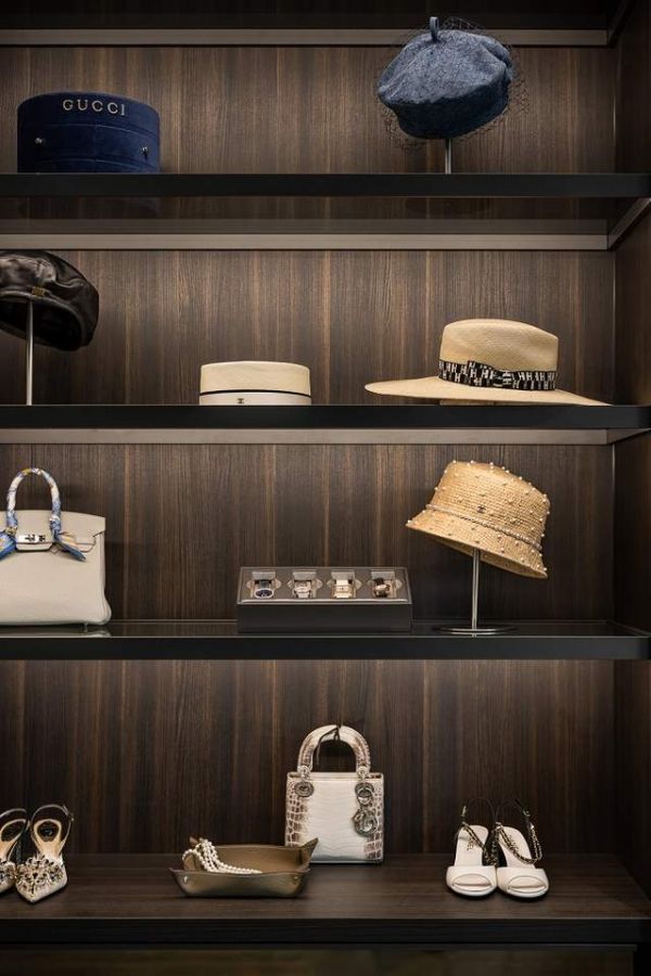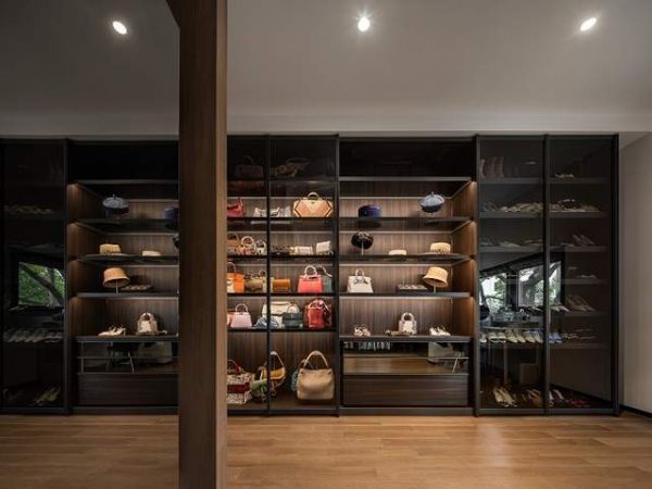这个系列有着强大的收纳展示功能,凭借超薄纤盈的金属框架搭配透明质感的玻璃,既做到了空间感,又解决了防尘问题。组合柜按女主使用习惯做了包包收藏柜和鞋柜,中间作开放展示,堪称每个女人的梦中情柜。