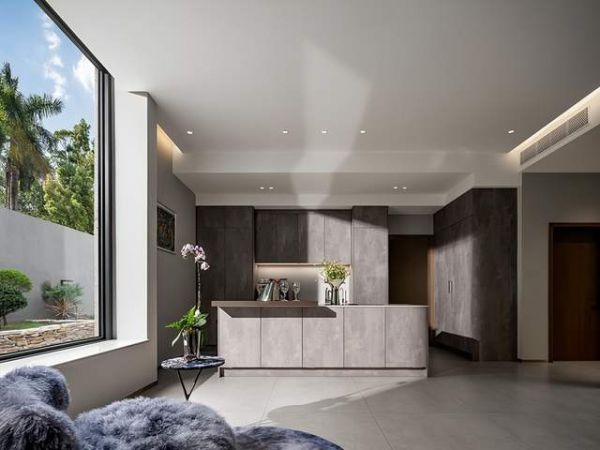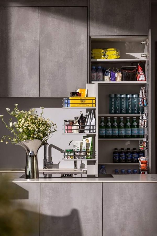 为了形成整体的极简工业风格,西厨的门板选用LEICHT劳斯的IKONO系列,仿混凝土材质和墙面的白色涂料形成对比,更加突出冷艳和精致气息。