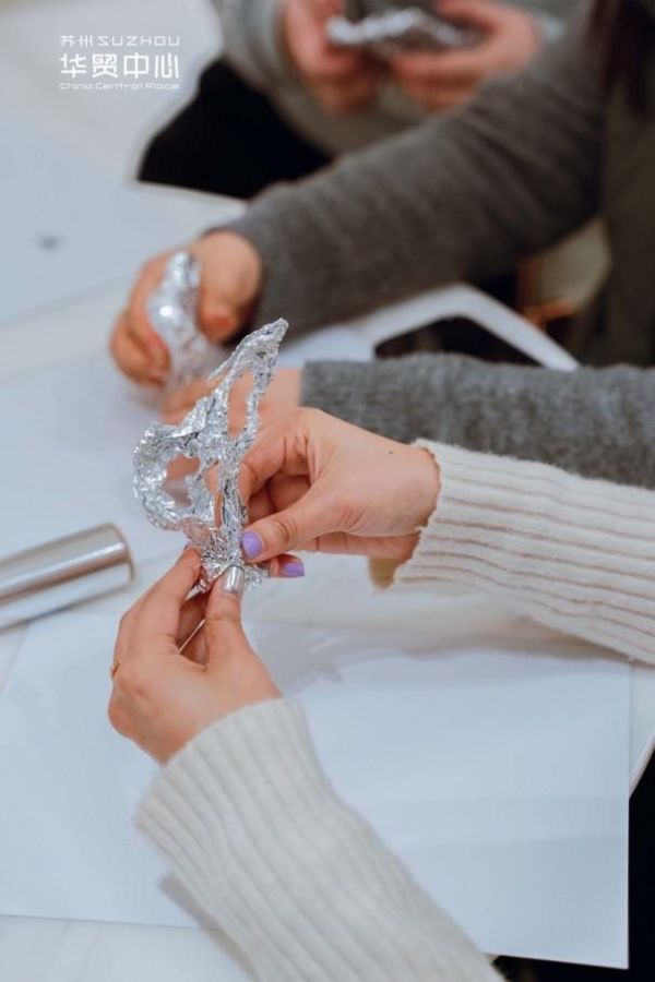 在1月19日的艺术分享会上,刘玥拉姆以“身无长物却似是而非”为主题,围绕水的各种形态进行观察的分享,由水和多种相关意象推导出她眼中的苏州之精神。活动上,刘玥拉姆还带领嘉宾们用锡纸塑造自己心中的假山,借由光影在宣纸上绘出图案并进行想象的延伸。独属于苏州华贸中心、姑苏里、紫芝园的气息被捕捉,留存在画卷上,以微观场景感知苏州独有的古意与当代的冲撞。