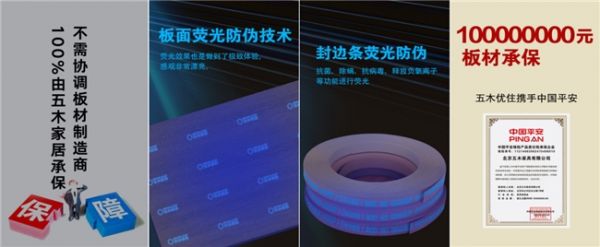 为了防止市场上的假冒伪劣产品,五木优住板材采用了先进的荧光防伪技术,其荧光效果不仅具有高度的观赏性,还提供了极为可靠的防伪验证手段,为消费者提供了双重保障。