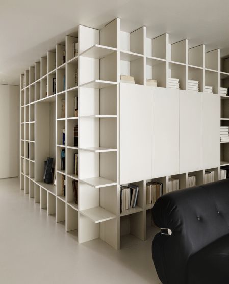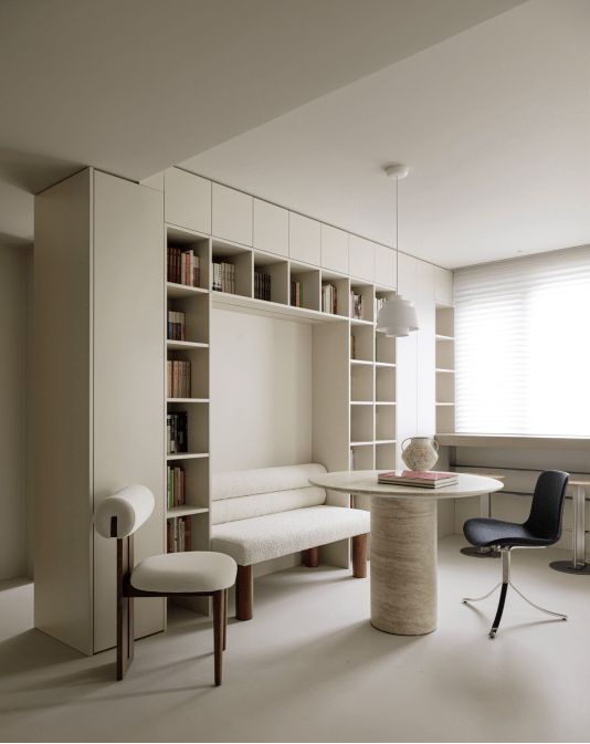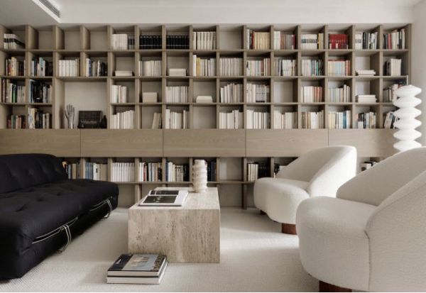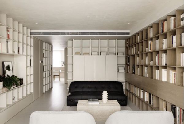 在量房的时候我们看了这对夫妻的书,尺寸比较窄小的居多,所以当设计书柜尺寸的时候,也是根据现有图书的大小,精准匹配收纳。既要把一万册书收纳好,又要保留舒适的生活空间,我们刻意没有给书柜做背板,最大限度运用空间。