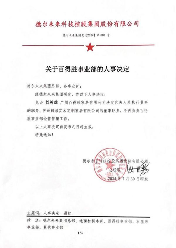 德尔未来集团关于百得胜事业部的人事任免决定。