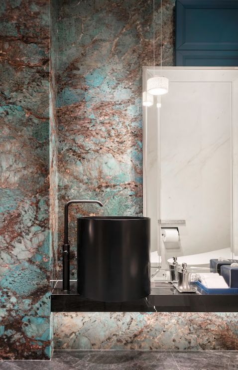 客浴室设计十分考究,墙面采用了带有繁复纹理和质感的蒂芙尼蓝大理石,经过巧妙排列组合,创造出引人注目的视觉效果,并以绿色的皮革墙板加以点缀。每一块大理石都经精心挑选,增强了整体构图的深度和复杂性。皮革墙板与石墙的自然纹理形成鲜明的视觉对比,散发出现代优雅韵味。当门打开时,盥洗室便化身为迷人的艺术空间,邀请宾客沉浸在其引人入胜的奇观中。
