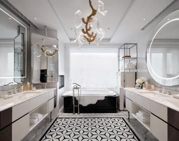 公寓的鞋室和步入式衣帽间体现了屋主对实用性和优雅的追求。这些空间仿佛设计精美的珠宝盒,展示了配饰收藏和服饰,兼具功能性和美感。浴室则展现了公寓对细节的极致关注。以精选优质建材打造的艺术感浴缸为中心,令业主沉浸于华美世界中。马赛克纹理大理石地板宏伟大气,而珍珠母白色马赛克纹理墙壁则增添了优雅与精致,营造出这处奢华空间的非凡氛围。