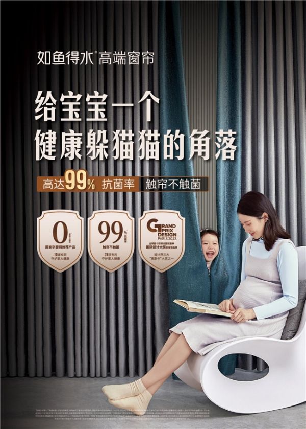 除了制作工艺细节佳外,如鱼得水还将抗菌技术运用到窗帘面料中,以高达99%抗菌率高效抵御病菌,8项核心专利强化抗菌功能,解决了窗帘细菌滋生、发霉异味等日常家居生活痛点,婴幼儿家庭也可放心使用,触帘不触菌,还给宝宝一个健康舒适的躲猫猫空间。
