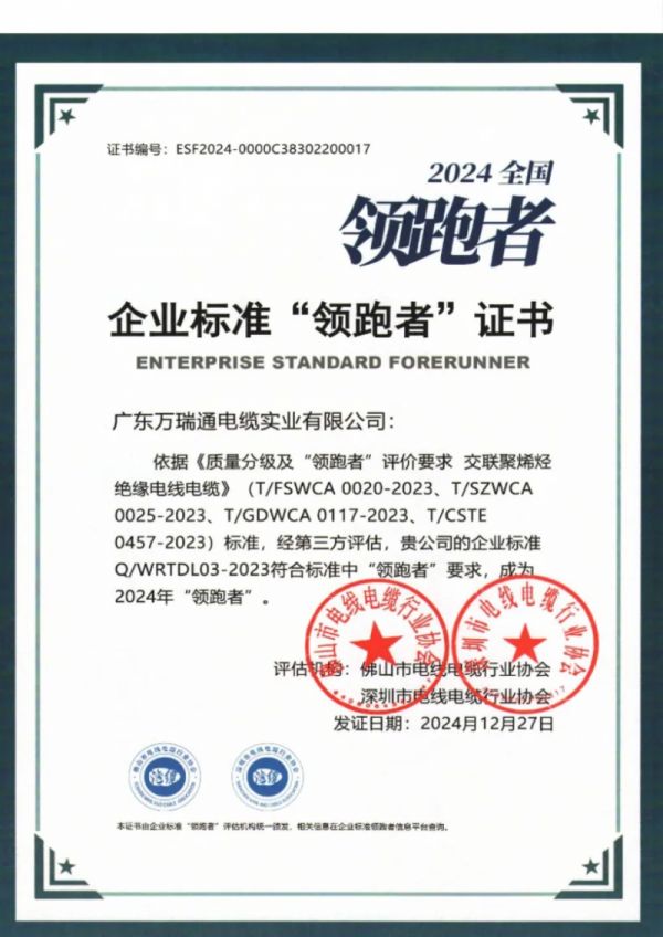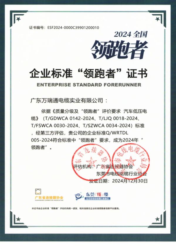 大会对2024年度荣获全国企业标准“领跑者”称号的企业以及参与重要国家标准编制、推动行业高质量发展的企业进行表彰。万瑞通电缆凭借卓越的产品质量、领先的技术水平和严格的企业标准荣获2024年全国汽车低压电缆、电器设备内部连接线缆、交联聚烯烃绝缘电线电缆以及塑料绝缘控制电缆全国企业标准“领跑者”证书。获此荣誉是协会对万瑞通一直以来坚持技术创新驱动、严格质量管控、积极履行社会责任的认可与肯定!