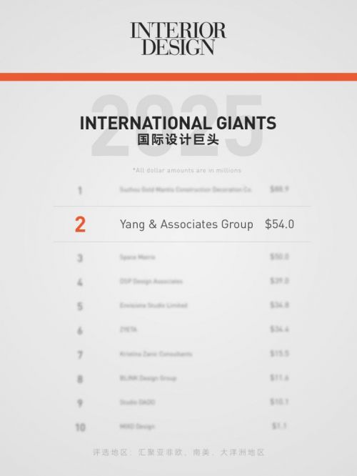 近日,全球权威室内设计媒体《Interior Design》发起的TOP 100Giants全球设计巨头榜正式揭晓,YANG荣登International Giants国际设计巨头TOP2。这一突破性成绩不仅刷新了YANG全球酒店设计公司百大排名TOP 5的成绩,标志着集团在酒店、地产、软装、艺术品等多维领域的齐头并进,更象征着东方设计在国际舞台上的影响力达到全新高度。