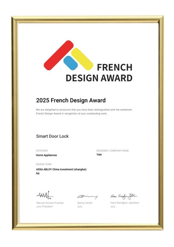 法国设计奖由国际设计奖协会(IAA)主办,是全球创意领域最具影响力的奖项之一,以‘前瞻性、创新性、功能性’为核心评审标准,并由全球顶l尖设计专家与教授组成评审团,代表着国际设计领域的至高审美与专业水准。此次耶鲁智能锁 YH1163M荣获法国设计奖金奖,得益于在产品设计理念和创新工艺上的卓越成就,也标志着Yale耶鲁在全球智能锁具领域的设计和创新能力再获国际认可。