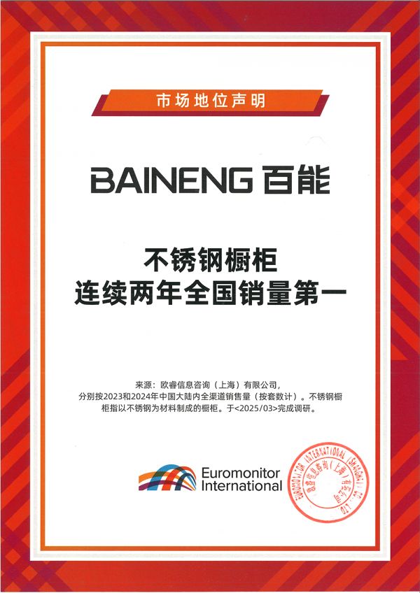 近日,根据国际权威调研机构欧睿国际公布最新数据,百能不锈钢橱柜全国销量连续两年位居第一,百能以近1/3的不锈钢橱柜市场份额持续领先 ,彰显了百能品牌的强大实力与市场认可度!