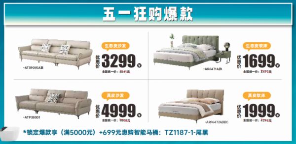 ARP6472 A/B/C爆款真皮软床:实木床身,接触面全真皮,内部填充高回弹定型海绵,躺下包裹感十足;齐边床造型,简约不臃肿;围边软包,避免磕碰。全国统一价4292元,活动价仅1999 元。以上单品购买满5000元,即享699元惠购智能马桶:TZ1187-1-尾黑。
