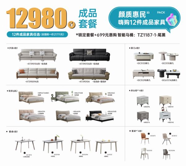 原价21711元的成品家具套餐,含沙发、床、床头柜、茶几、餐桌和餐椅12件,活动价12980元,锁定套餐还能699元惠购智能马桶:TZ1187-1-尾黑。