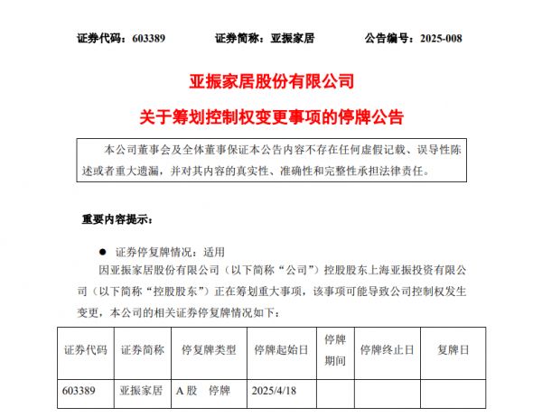 公司于2025年4月17日收到公司控股股东的通知,控股股东正在筹划公司股份协议转让事宜,该事项可能导致公司控制权发生变更。鉴于上述事项正在洽谈当中,尚存在不确定性,为保证公平信息披露,维护投资者利益,避免造成公司股价异常波动,根据《上海证券交易所股票上市规则》《上海证券交易所上市公司自律监管指引第 4 号——停复牌》等有关规定,经公司向上海证券交易所申请,公司股票(证券代码:603389,证券简称:亚振家居)将于2025 年4月18日(星期五)开市起停牌,停牌时间不超过2天。