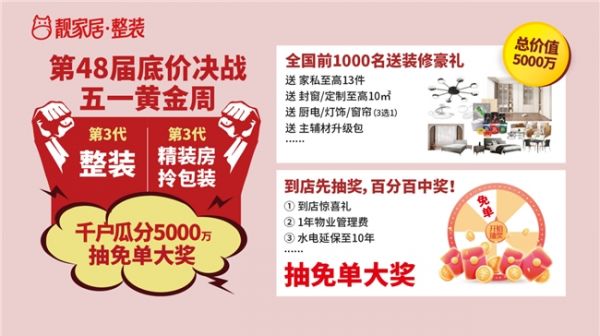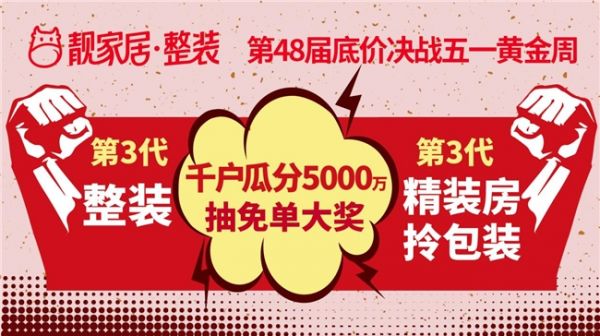 恰逢一年一度的五一大促,靓家居第48届底价决战五一黄金周火爆来袭,第三代整装+第三代精装房拎包装,双拳出击!带来省心拎包住的高品质家装服务。同时,靓家居携手百大品牌联合补贴,全民瓜分5000万装修福利,还可抽免单大奖!