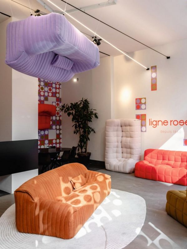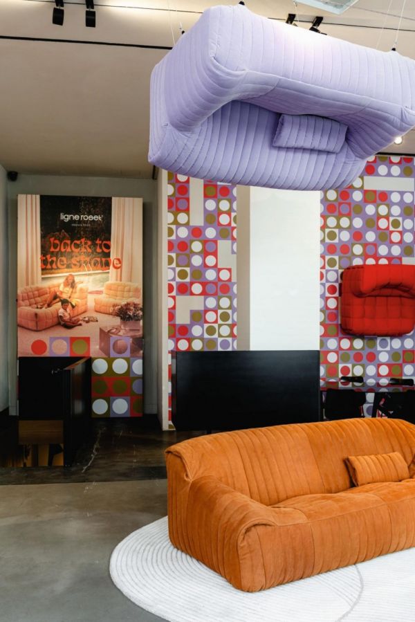 这一时期的作品突破传统家具的“功能性束缚”,将沙发、边柜等日常物件转化为空间艺术品。策展中Ligne Roset甚至以悬挂式视角重新解构经典,呼应了70年代设计师对“环境艺术”的探索——家具不仅是使用工具,更是塑造空间氛围的雕塑。