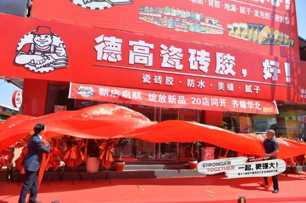 在热烈的庆典氛围中,20个主分会场同步举行揭幕仪式。随着红绸揭落,"德高瓷砖胶,好!"的醒目红店招闪耀亮相,宣告华北大区20店盛大开业迎客。