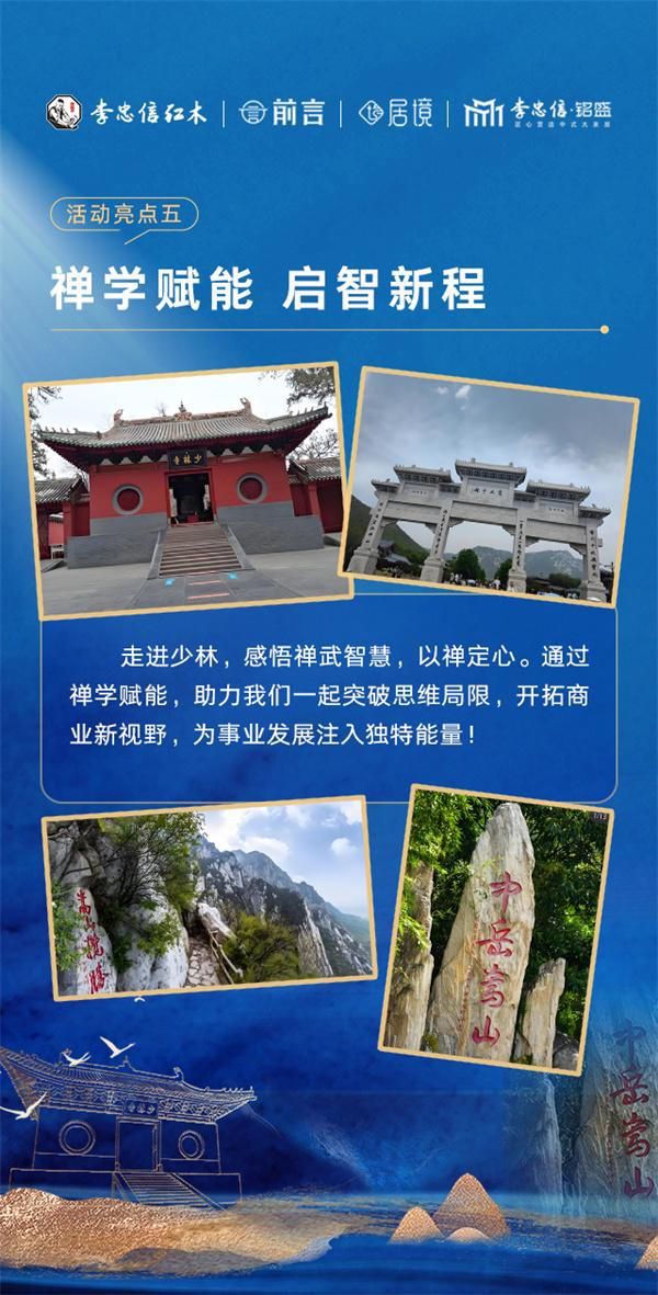 作为本届大会的压轴亮点,全体参会者将踏上一场非凡之旅,赴千年少林寺,开启一场禅学赋能之旅。在这片古刹圣地,我们将在禅意的熏陶中,突破思维的藩篱,开拓商业的新视野,为事业发展注入独特能量。
