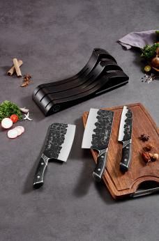 获奖作品“寅木·星魁”以“浩瀚宇宙”为灵感源泉,将星际光耀与月球陨坑肌理融入刀身设计,传统饕餮纹路的复刻更赋予其东方文化图腾的深邃内涵。刀身采用高碳复合钢材质,通过复古锻打锤纹与冰锻淬火工艺的结合,使每一寸凹凸纹理均经流体力学精密计算,形成天然防粘结构,实现“切肥不沾脂、剁肉0残留”的实用效果。手柄选用优质黑彩木,人体工学流线设计确保握感贴合自然,打造“人刀合一”的操控体验。从外观到功能,“寅木·星魁”以创新设计重新定义厨刀美学标准。