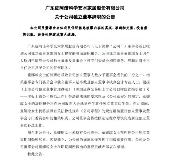 6月24日,广东皮阿诺科学艺术家居股份有限公司(以下简称:皮阿诺)发布了一则关于公司独立董事辞职的公告。