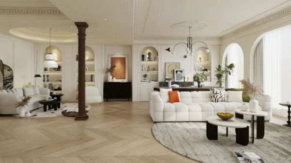 法式奶油:删繁就简去掉传统法式的复杂厚重,搭配温柔材质打造出轻盈、柔和、温馨又带点慵懒感觉的装修风格。建议颜色以米白、薄荷绿、淡粉这些柔和的色彩为主,小面积使用石膏线、小雕花、水晶吊灯和舒服的布艺软装营造家的精致浪漫。这种风格符合现代人的审美,给人软糯、舒适的温馨。