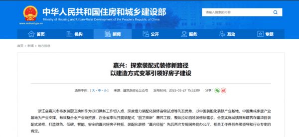 住建部曾在今年3月分享过嘉兴市探索装配式装修的新路径。其中重点提到嘉兴如何以建造方式的变革引领好房子建设,具体指将家装厨卫换新作为以旧换新工作切入点,深度借力装配化装修省级试点等先发优势,开展装配式“厨卫换新”惠民工程,整体拉动百姓装修新需求。