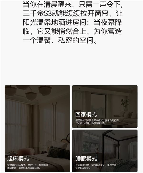 如果说普通窗帘是“遮光的布”或者“装饰的画”,那三千金的智能窗帘更像“懂生活的家居帮手”。它没把智能做成花哨的噱头,反而在日常使用的每个细节里,藏着让人越用越顺手的设计。