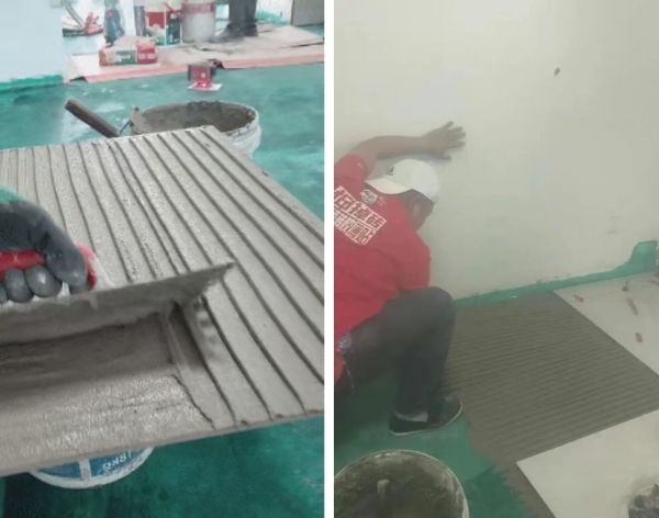 来,给大家展示下,我用地宝瓷砖胶铺贴客厅地砖的施工现场。整个过程下来,我觉得德高地宝瓷砖胶省时省力,批刮流畅也很满浆,还有就是柔韧性、抗压性很给力。