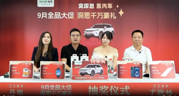 9月金秋,湖南深思电工实业有限公司以“千万豪礼”为引擎,发起覆盖全国终端门店的全品大促活动。当全国抽奖直播的镜头对准特等奖中奖编号时,这场贯穿整月、横跨线上线下的深度联动,迎来了它的高光时刻!浙江丽水的王总在全国抽奖直播间抽中比亚迪SUV(使用权),成为渠道伙伴羡慕的“幸运锦鲤”。