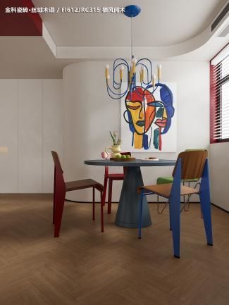 • 色彩游戏:暖棕色的木纹砖是理想的背景板,巧妙中和了客厅的红色单椅、餐厅的蓝绿餐椅和大胆的彩色抽象画。这种装修风格,既有原木风的基底,又让彩色家具成为视觉焦点,艺术感十足。