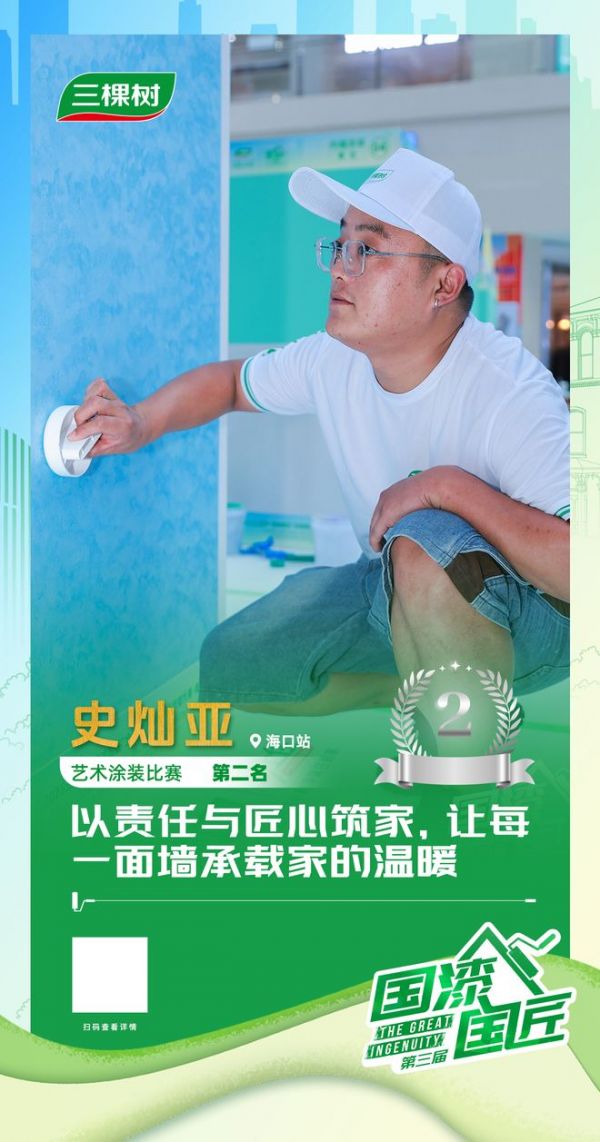十月海口,暖湿的海风拂过骑楼老街的南洋窗棂。2025三棵树“国漆国匠”第三届全国建筑涂装职业技能大赛海口站刚刚落幕,此次艺术涂装赛道银牌获得者史灿亚,他是一位拥有七年从业经验的匠人。从跟随同村前辈北上学习,到扎根海口家装行业独当一面,他将“把每一套房子当作自己的房子来装”视为工匠精神的核心。赛后,网易家居独家对话史灿亚,聆听这位专注艺术涂装的匠人,如何用责任与用心,在每一面墙上留下岁月的质感。