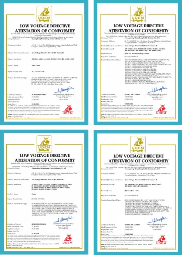 近日,我司成功通过UDEM(Uluslararası Belgelendirme Denetim Eğitim Merkezi)的严格审核,一次性获得四项欧盟低压指令(2014/35/EU)符合性证书,涵盖中低压电力电缆、通用电缆、光伏电缆及数据电缆等多类产品。这标志着公司在产品质量、技术规范与欧盟标准接轨方面迈出了坚实一步!