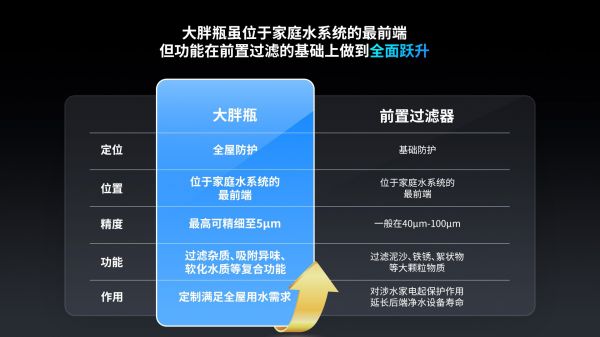 传统家庭净水方案大多只聚焦于末端饮用水处理,而「大胖瓶」将净水节点前置至家庭水路系统入口,从前端开始,就为家庭水质把关。区别于传统前置过滤器,该系统过滤精度最高达5微米,不仅可有效拦截铁锈、泥沙等大颗粒杂质,还能同步处理余氯、异色异味等溶解性污染物等复合功能,实现对全屋用水的整体净化。