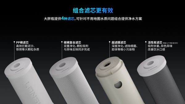 「大胖瓶全屋中央过滤器」采用新颖的模块化滤芯设计,提供UF超滤膜滤芯、CTO活性炭滤芯、PP棉滤芯、FPC碳棉复合滤芯多款选择。四款专业滤芯,可以让用户根据地区水质特征与家庭用水需求,自由组合搭配,实现从基础过滤到深度净化的个性化解决方案。