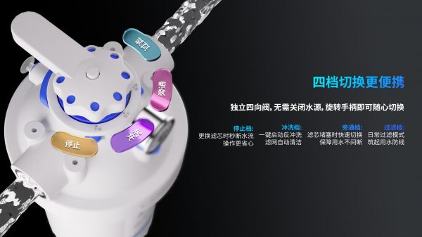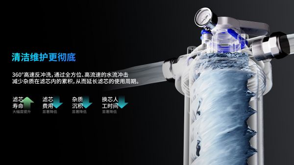「大胖瓶全屋中央过滤器」澎湃出水流量,可同时满足沐浴、烹饪、洗衣等多场景用水需求。独立的四向阀控制系统实现过滤、反冲洗、旁通、停机四种模式的便捷切换,360°高速反冲洗技术则有效延长滤芯使用寿命,降低系统维护成本。