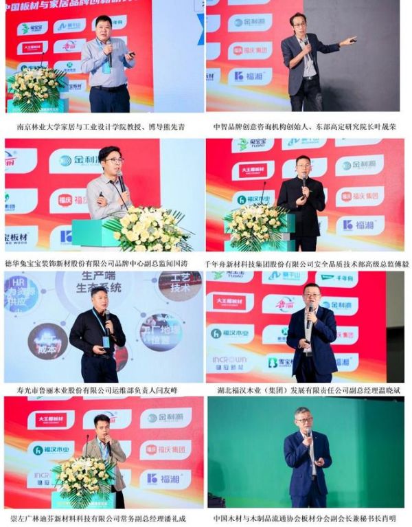主题演讲环节,南京林业大学家居与工业设计学院教授、博导熊先青,中智品牌创意咨询机构创始人、东部高定研究院长叶晟荣,德华兔宝宝装饰新材股份有限公司品牌中心副总监闻国涛,千年舟新材科技集团股份有限公司安全品质技术部高级总监傅毅,寿光市鲁丽木业股份有限公司运维部负责人闫友峰,湖北福汉木业(集团)发展有限责任公司副总经理温晓斌,崇左广林迪芬新材料科技有限公司常务副总经理潘礼成,中国木材与木制品流通协会板材分会副会长兼秘书长肖明分别就家居智能制造与产品设计、板材品牌创新与价值提升、大规模连续平压MDI胶合板创新实践、人造板流通市场现状和产业趋势发表演讲。