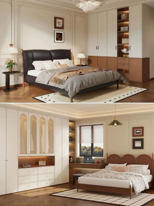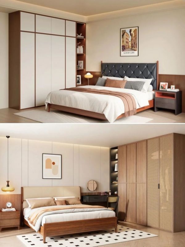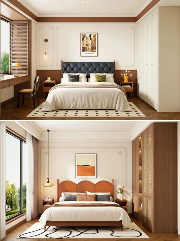 浅杏色软包皮床慵懒而治愈,焦糖色胡桃木床经典不过时。