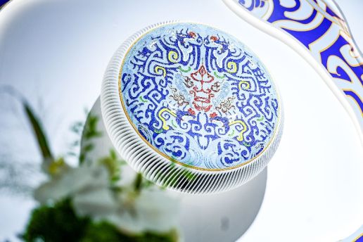 珐琅臻彩系列今年的核心纹样灵感源自清代掐丝珐琅龙凤纹双连扁瓶。双联器型与龙凤图腾,共同诠释“和谐共生”的美好愿景。扁瓶造型不仅稳固易陈,更为珐琅纹样提供了完整的展示空间。