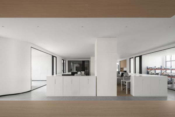 核心功能区中,开放式办公区采用原白色定制工位桌,桌面边缘圆润处理,搭配灰色人体工学椅,在硬朗的办公氛围中注入自然温度。