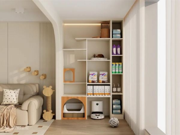 电视柜可采用悬空设计,左侧嵌入宠物休息舱,右侧延伸出多层猫爬架,底部空间刚好容纳食盆水碗。既满足宠物休憩、玩耍、进食的需求,又保持空间的整洁美观。