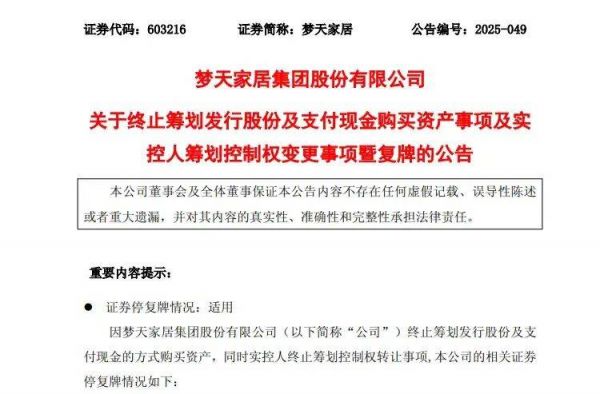 2025年11月18日,梦天家居发布公告,宣布终止筹划发行股份及支付现金购买上海川土微电子股份有限公司控制权事项,同时终止实控人余静渊的控制权转让计划。
