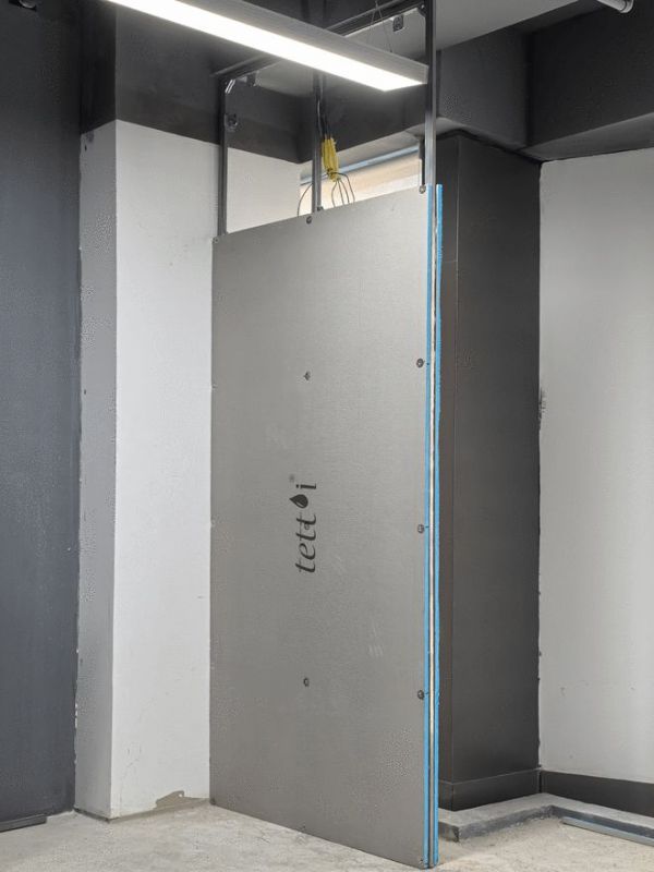 tetti防水背衬系统+快装龙骨系统打造的新式隔墙厚度可以小于8cm,与传统砌墙的12cm厚度相比,它能有效减少厚度、节省空间。墙体虽然轻薄但是结构牢固,在我们现场进行的50kg沙包的柔性冲击测试中仍能保持稳定不变形。同时装配式施工也避免了湿作业对现场工地环境的影响,让墙体更轻薄但不失稳固。