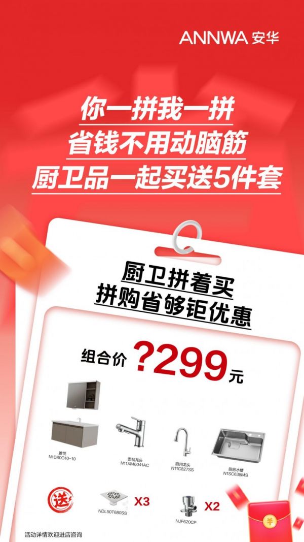 针对新房装修人群,创新推出“厨卫拼单”套餐,购买浴室柜、龙头、水槽等厨卫产品,即赠送安装所需的角阀地漏五件套,从细节处减轻装修负担。