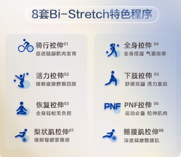 为了实现精准流畅的动作,A70MAX 搭载 7×2 双核芯片 + 10×2 双倍信号传输硬件,确保单腿牵引时力度可控、无卡顿。更贴心的是,它内置 8 套专业拉伸程序,覆盖不同场景需求:
